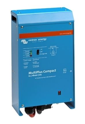 Многофункциональный синусный инвертор Victron Energy MultiPlus Compact 12/1600/70-16 является гибридным программируемым комплексом, оснащённым профессиональным четырёхступенчатым зарядным устройством аккумуляторных батарей (АКБ). Мощность инвертора: 1,3 кВт при 25°C. Мощность зарядного устройства: 70 А. В данную систему уже встроены необходимые компоненты, обеспечивающие удобство и безопасность эксплуатации. Имеется трансферное реле 16 А. Инвертор выполнен в компактном корпусе размером 375x214x110 мм.