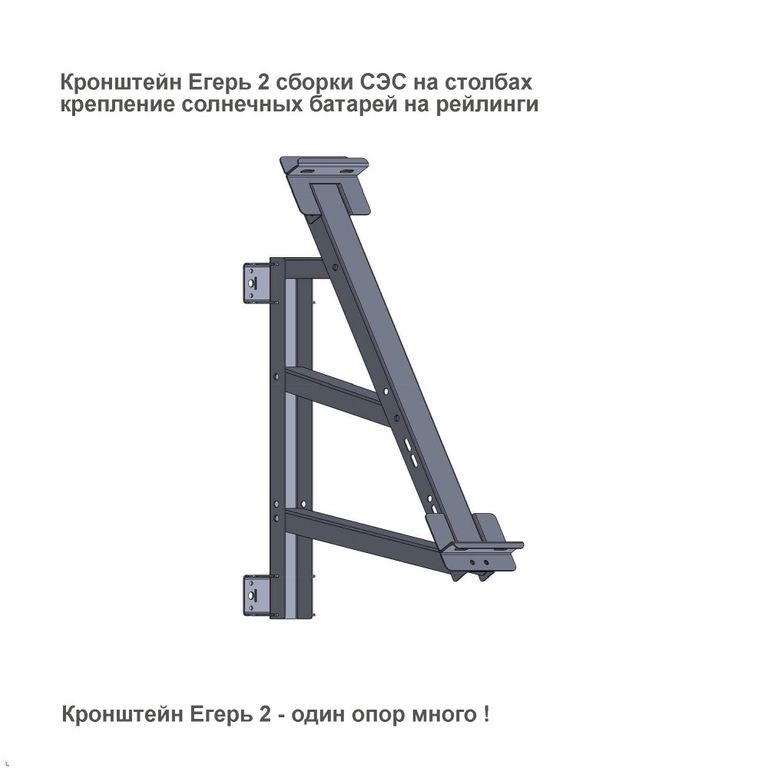 Возможна сборка солнечных систем (СЭС) с использованием кронштейна Егерь 2 для монтажа солнечных батарей: 2 столба или стена, 2 кронштейна Егерь 2 + 2 рейлинги = 2-3 солнечные батареи 200-320 Ватт.