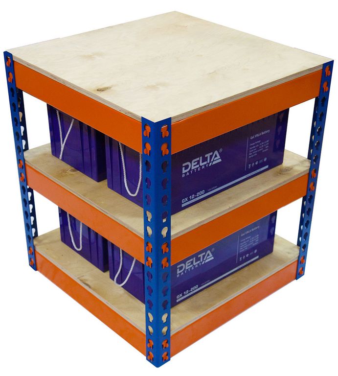 Стеллаж выдерживает нагрузку на одну полку до 350 кг. Стеллаж предназначен для удобного и компактного размещения 4 аккумуляторных батарей, емкостью 120-150 А*ч.